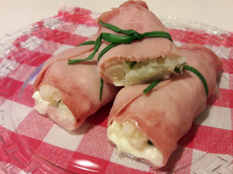 Farcire ogni fetta di prosciutto con un cucchiaio di cavolfiore e un pezzo di sottiletta, quindi arrotolare le fette di prosciutto e legare ogni involtino con un filo di erba cipollina.