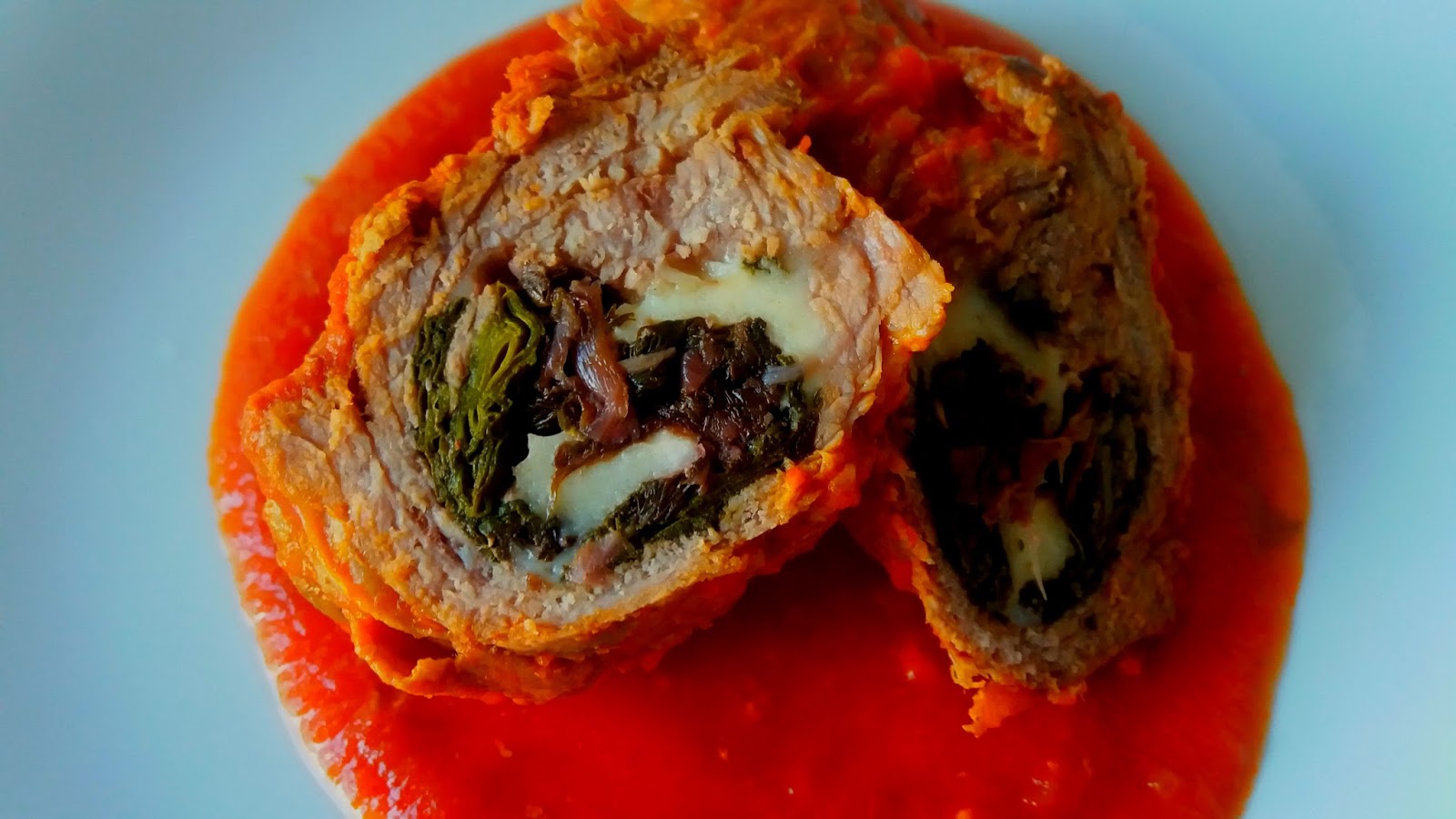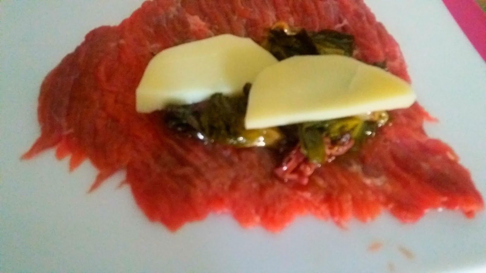 In ogni fettina una manciata di radicchio e 1 fetta di scamorza divisa a meta’,arrotolate