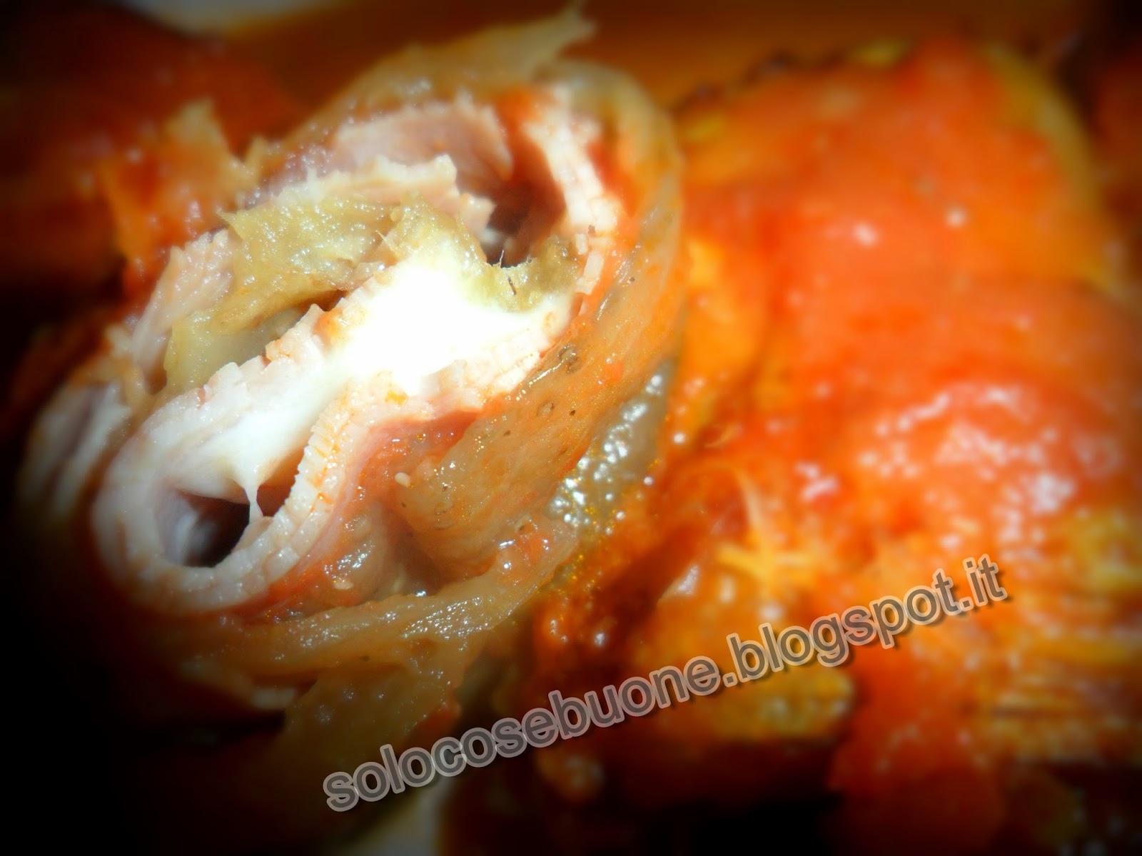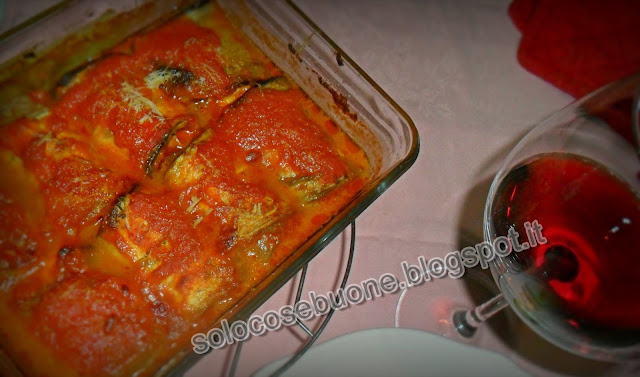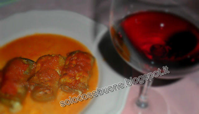 Arrotoliamo l’involtino di melanzana , scaldiamo la salsa di pomodoro e con essa cospargiamo il fondo di una pirofila da forno.