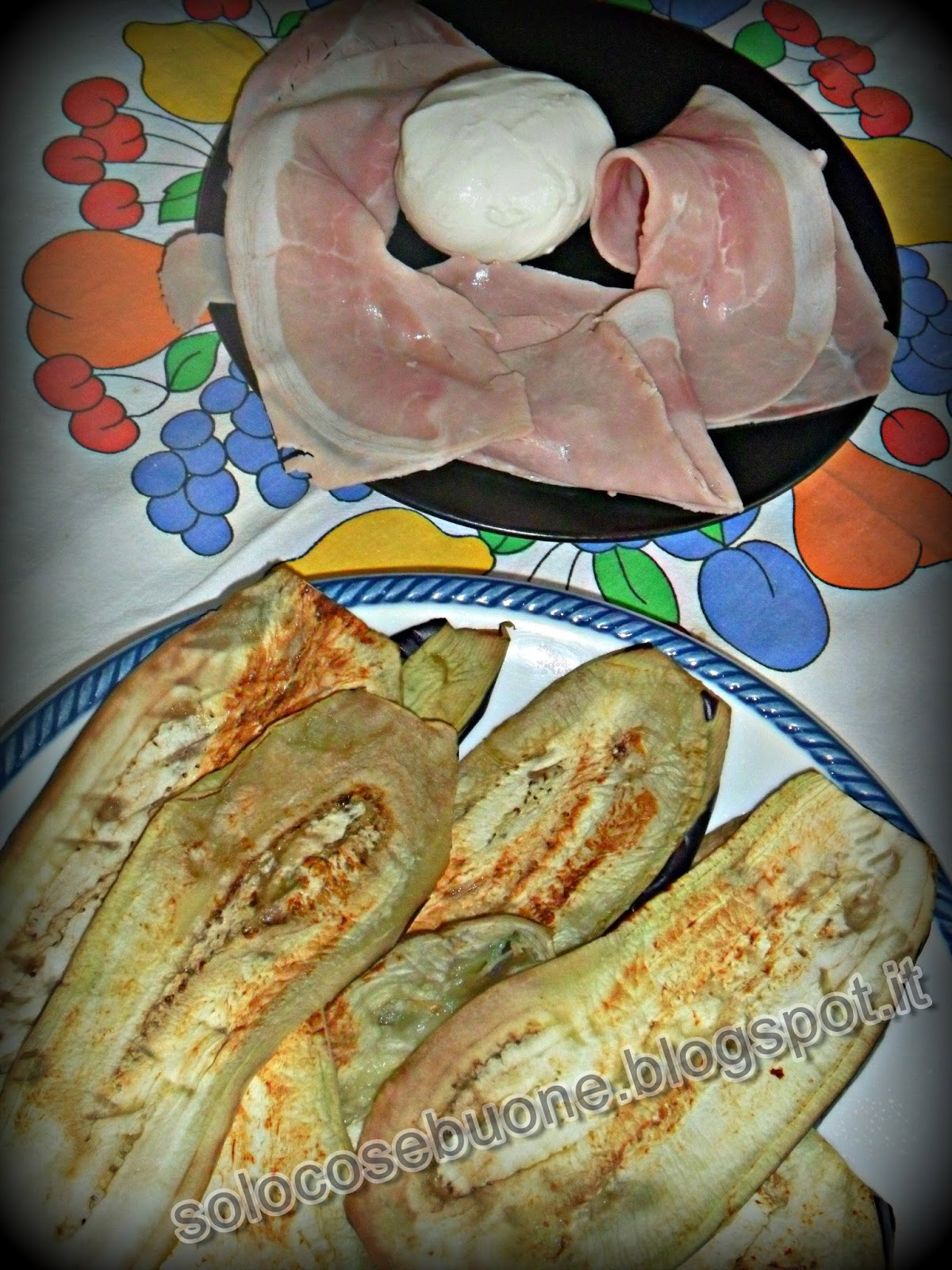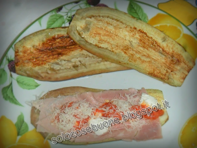 Tagliamo la melanzana nel verso della lunghezza in fette non troppo spesse e grigliamole da entrambi i lati. Su ogni fetta di melanzana stendiamo un po’ di salsa di pomodoro, una fettina di prosciutto cotto , qualche pezzo di mozzarella e un cucchiaino di parmigiano.