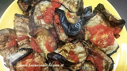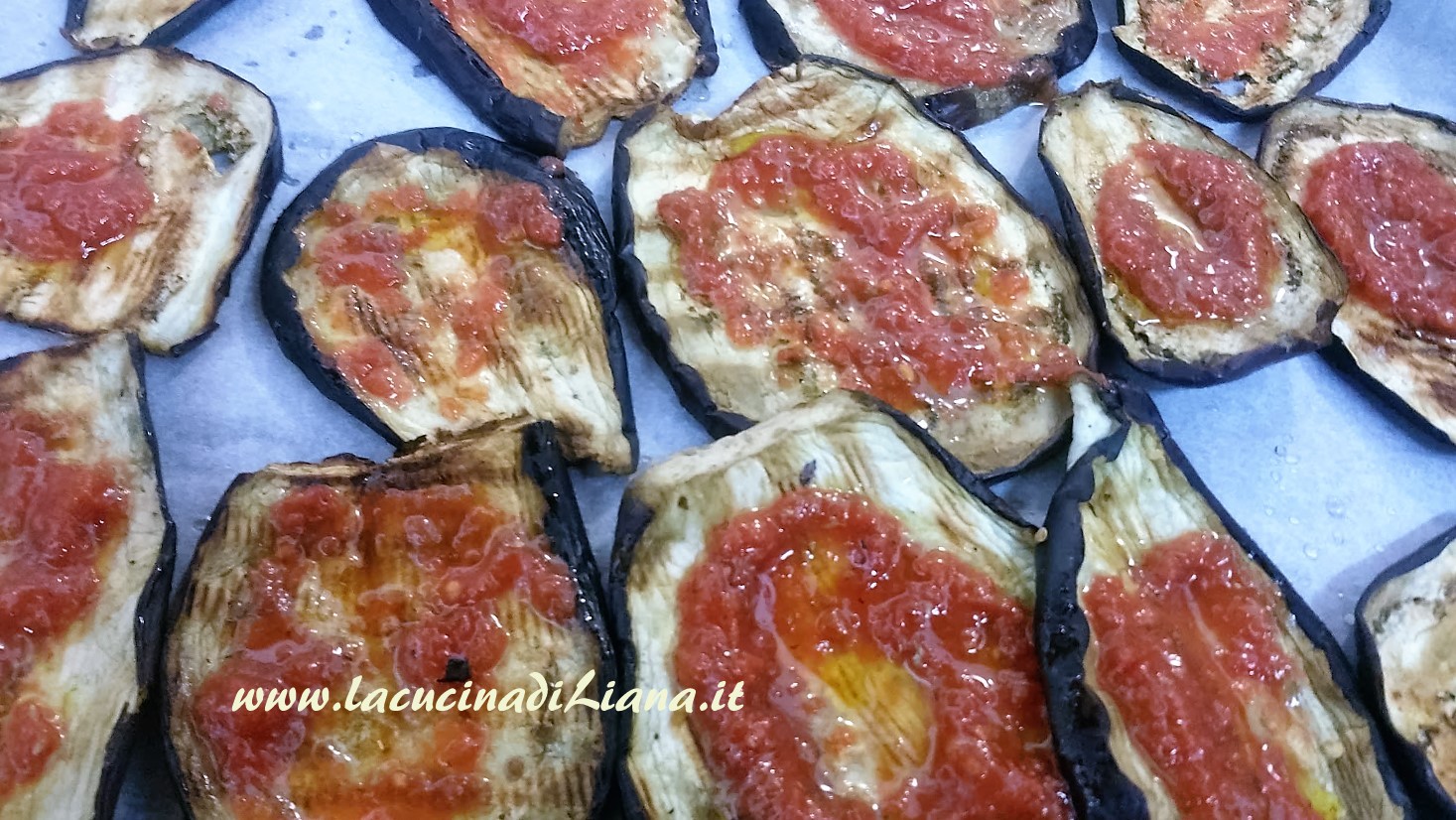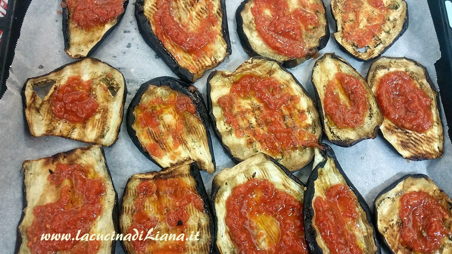 Affettare e grigliare le fette di melanzana. Condire con la salsa di pomodoro, con sale, aglio in polvere, origano e olio piccante.