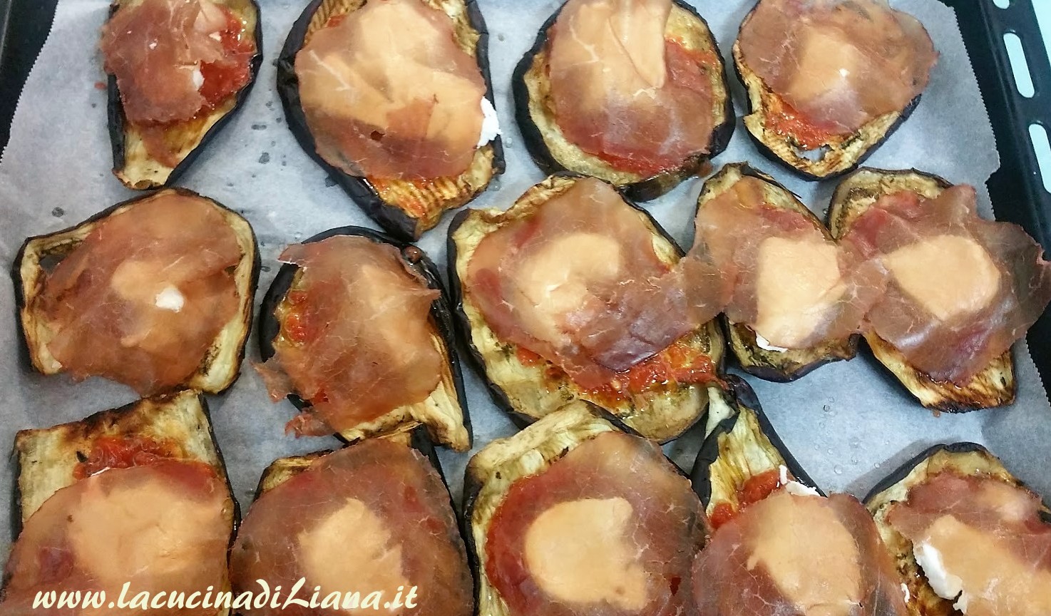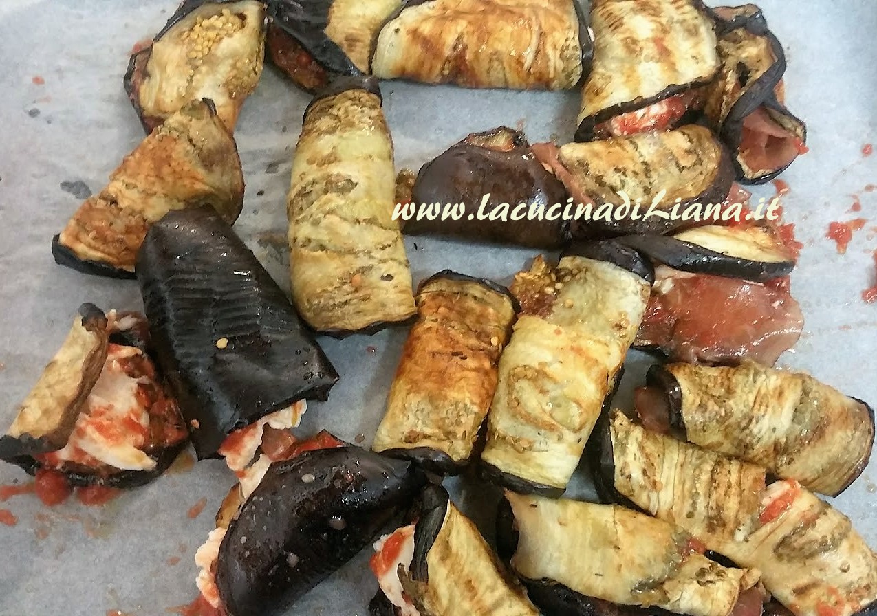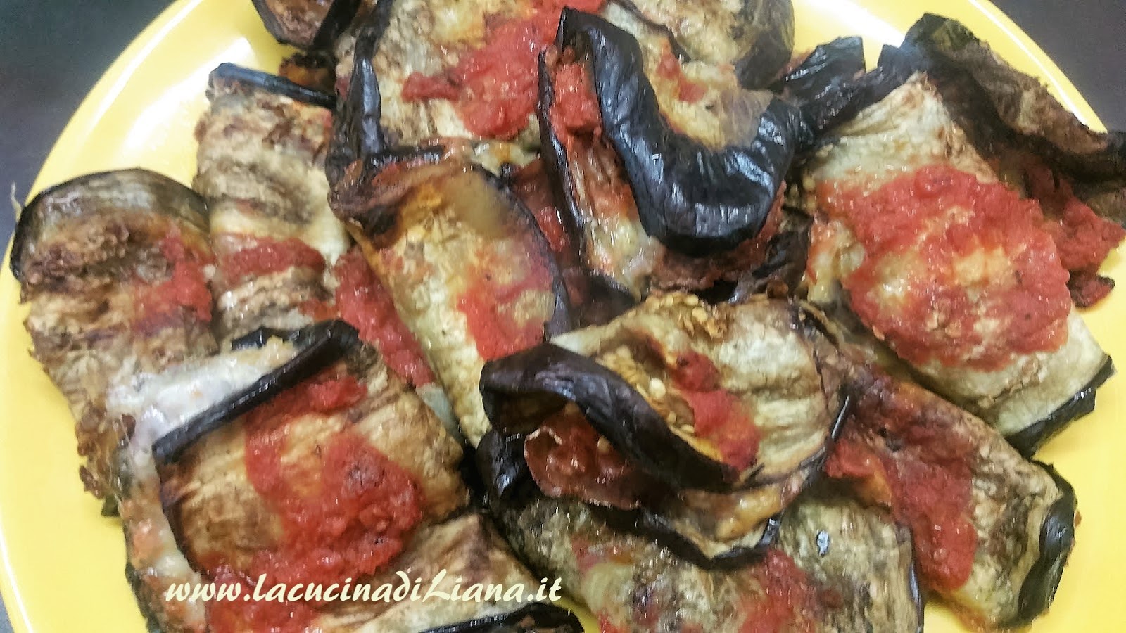 Disporre le melanzane sulla carta forno,bagnarle con un cucchiaio di salsa, porvi sopra una fetta di mozzarella e una di bresaola, chiudere gli involtini, bagnarli con la salsa rimasta e infornare a 200° ad aria ventilata per 15 minuti.