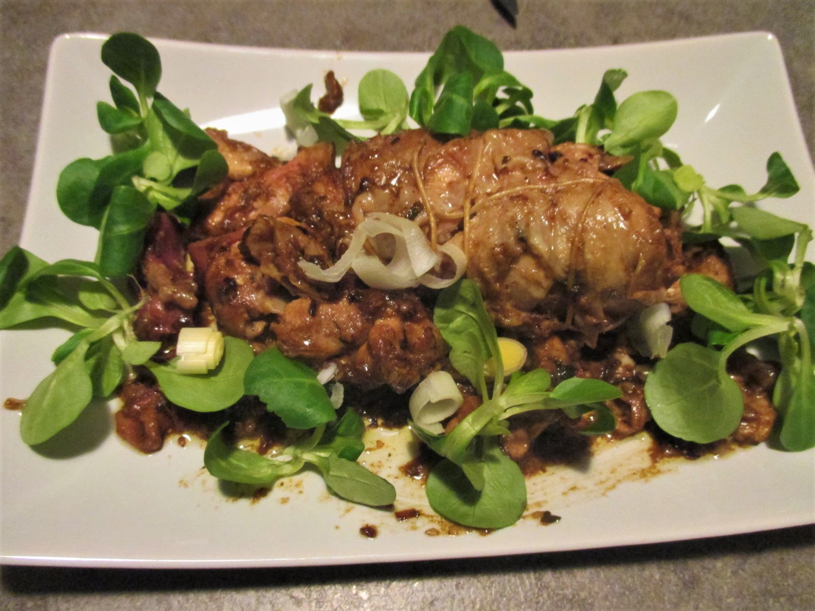 3) In una casseruola, fate un soffritto con olio, burro e il rimanente dello scalogno. Unite gli involtini e fateli rosolare fino a sigillare completamente la carne. Unite quindi la marinata e cuocete fino a cottura completa.