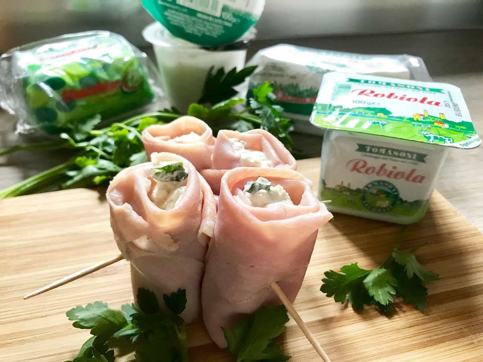 La prima ricetta proposta sono degli INVOLTINI DI PROSCIUTTO COTTO DI PRAGA RIPENI DI ROBIOLA TOMASONI. La robiola è fresca, morbida, color bianco come la neve.