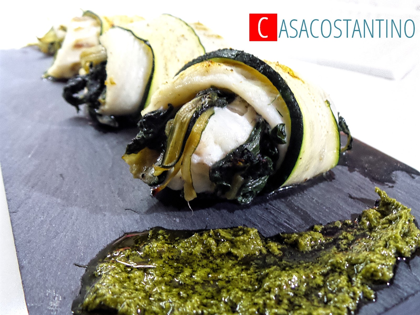 Trasferiamo gli involtini, affiancandoli, su di un vassoio di ardesia ed accompagniamoli con della deliziosa salsa verde