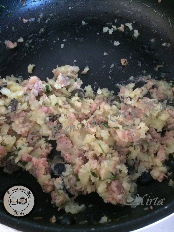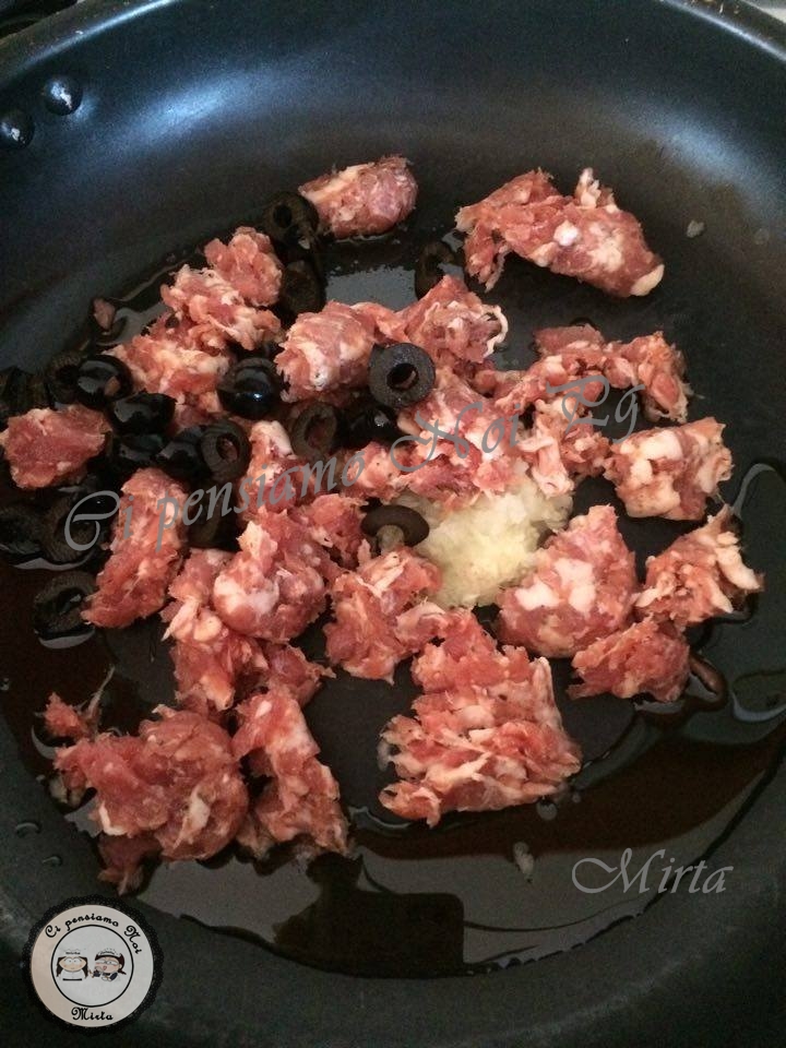 Ho svuotato la casseruola dall’acqua ho messo un filo d’olio, la cipolla e l’aglio tritati finemente e subito il mezzo bicchiere con lo spumante ( a me non piace fare soffritti, solo in rari casi!n.d.r)e la salsiccia tolta dal budellino e tagliata grossolanamente a coltello e le olive. ho fatto cuocere il tutto ma non ho messo sale, era già abbastanza saporito. Intanto ho messo in una pentola le patate a lessare. Quando queste sono cotte ho amalgamato tutto aggiungendoci pochissimo sale e prezzemolo.