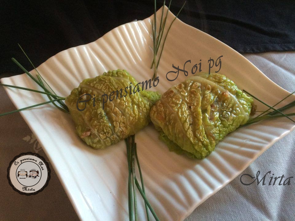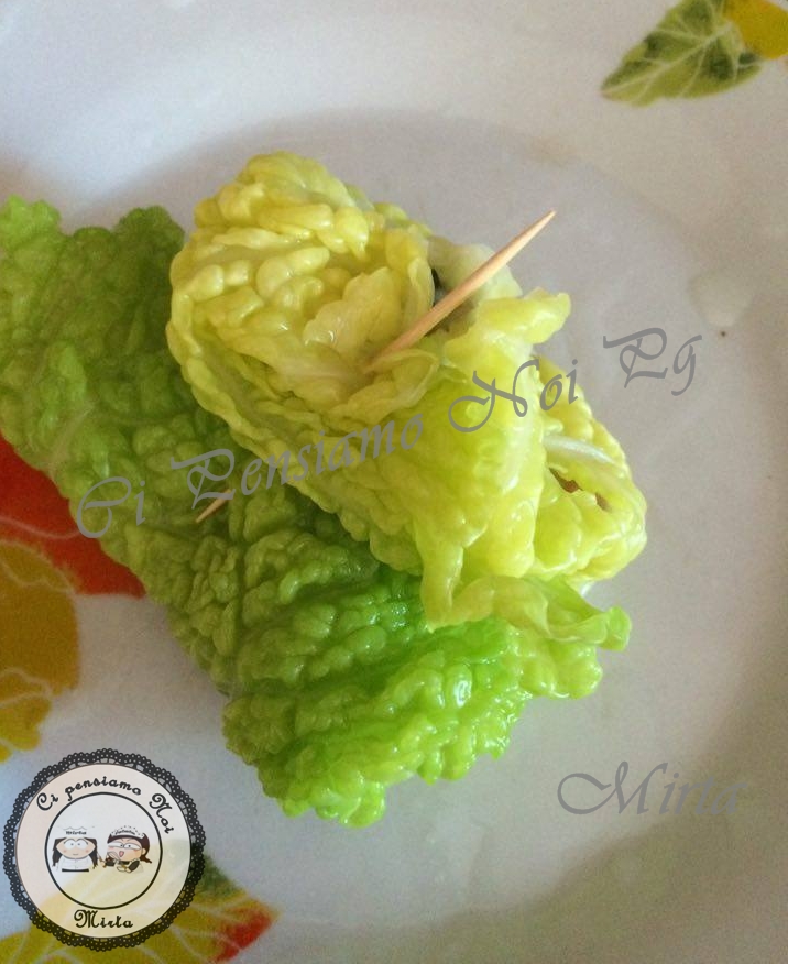 Ho preso un cucchiaio e ho crerato degli involtini con la verza fermandoli con gli stecchini.