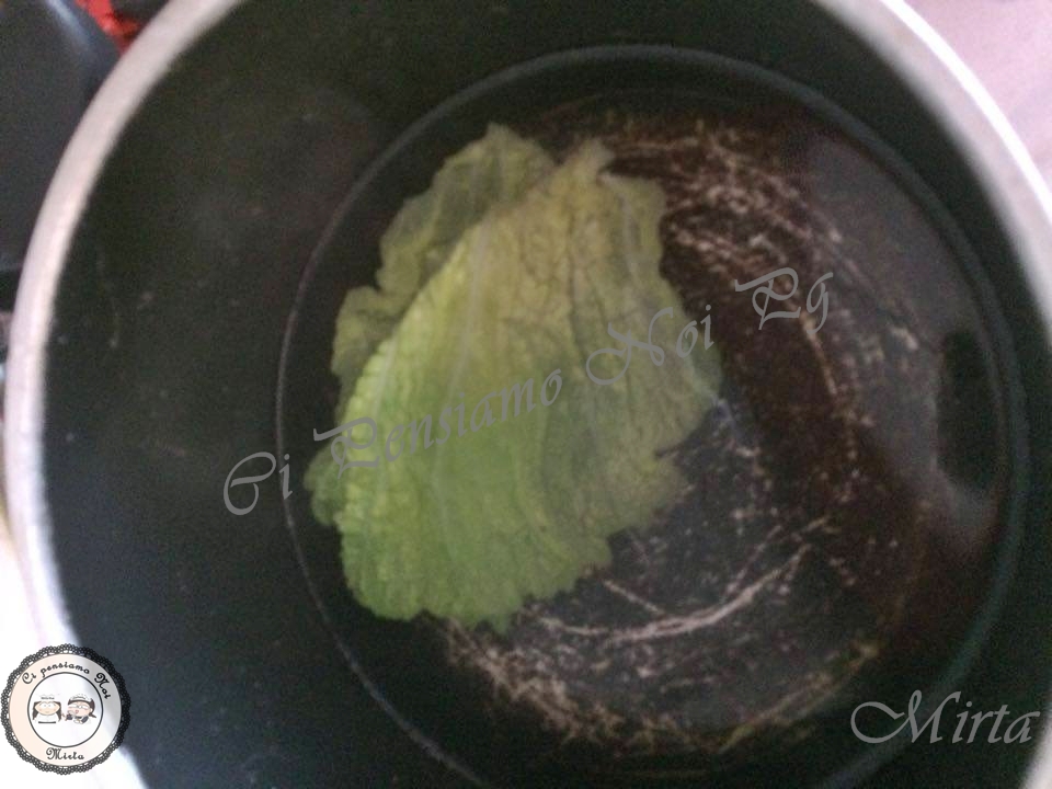 In una padella ho messo dell’acqua e l’ho fatta arrivare a ebollizione, ho scottato le foglie di verza per qualche minuto sia da una parte che dall’altra. Dopodichè le ho prese con una pinza e le ho messe subito in una ciotola(io ho usato una padella)con dell’acqua freddissima (ho preferito fargli fare uno shock termico per conservare il colore verde brillante anche dopo la cottura)