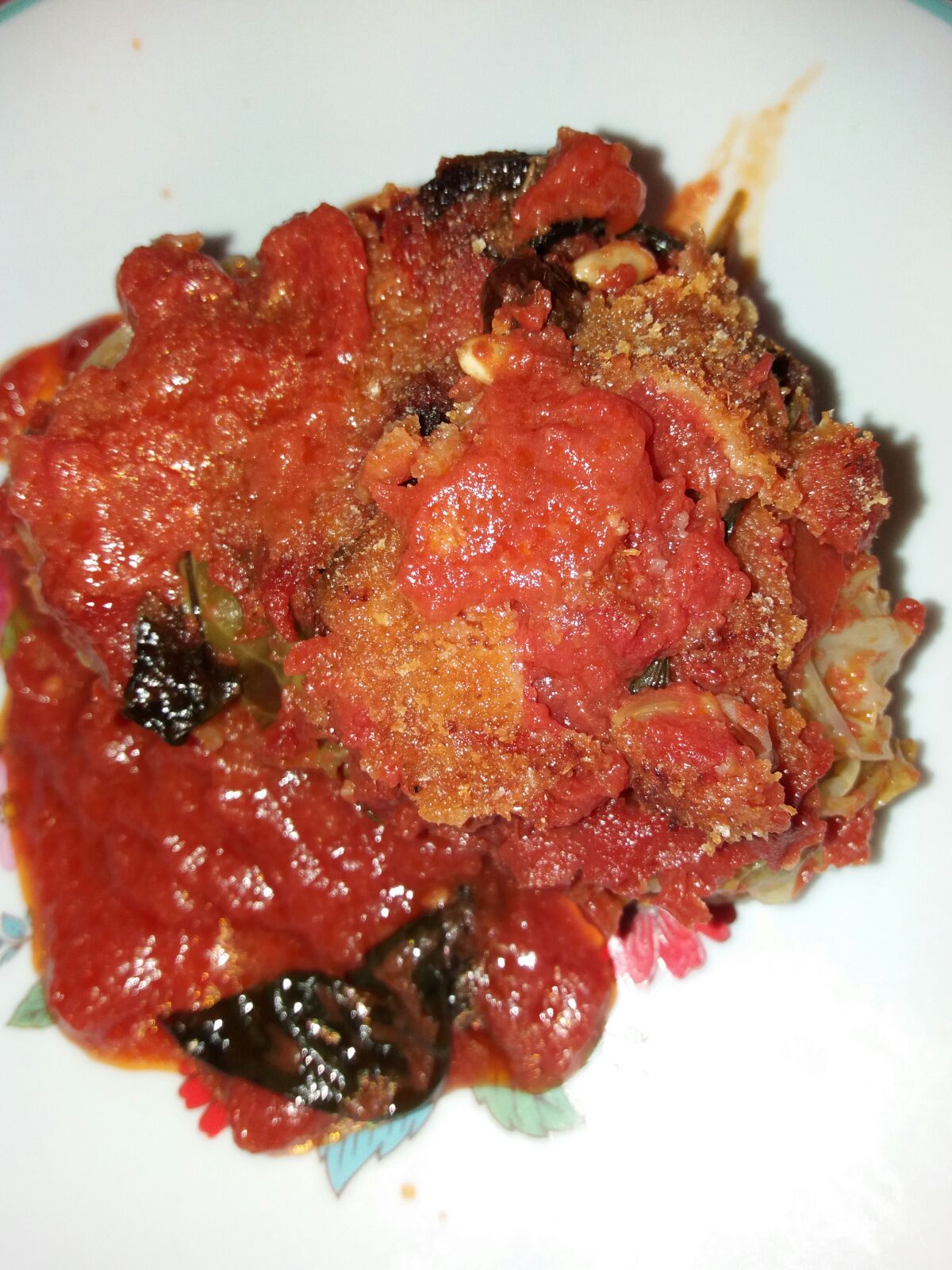 sugo di pomodoro(fatto con polpa di pomodoro ,olio e aglio imbiondito e uvetta e pinoli
