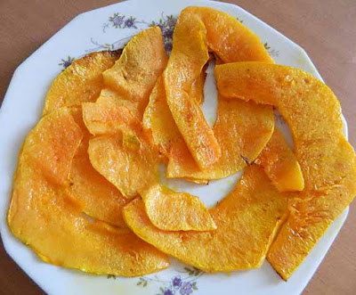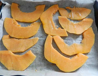 Lavare e pulire la zucca, affettare e mettere le fette sulla piastra del forno ricoperta di carta, salare e mettere un filo d’olio,