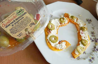 amalgamare gli ingredienti. Tagliare a rondelle le Olive Verdi Denocciolate. Riprendere la zucca sfornata e su ogni fetta cospargere la ricotta aromatizzata, le rondelle di olive e il pepe se piace,