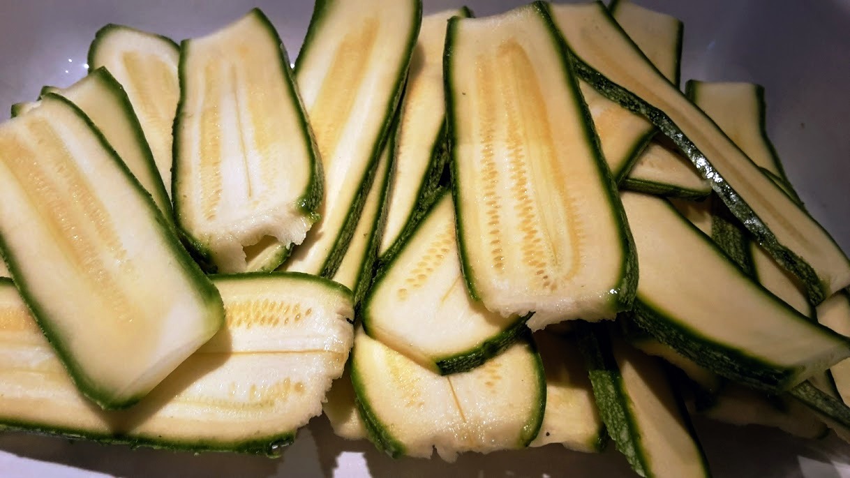 Unire un poco di olio e alcune delle fette di zucchina scartate in precedenza…