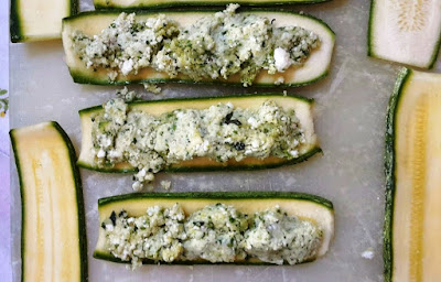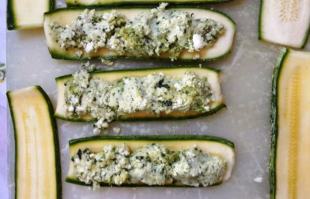 Disporre le fette di zucchina come appare in foto e farcirle con un poco di farcia distribuendola fra tutte le fette in modo omogeneo..