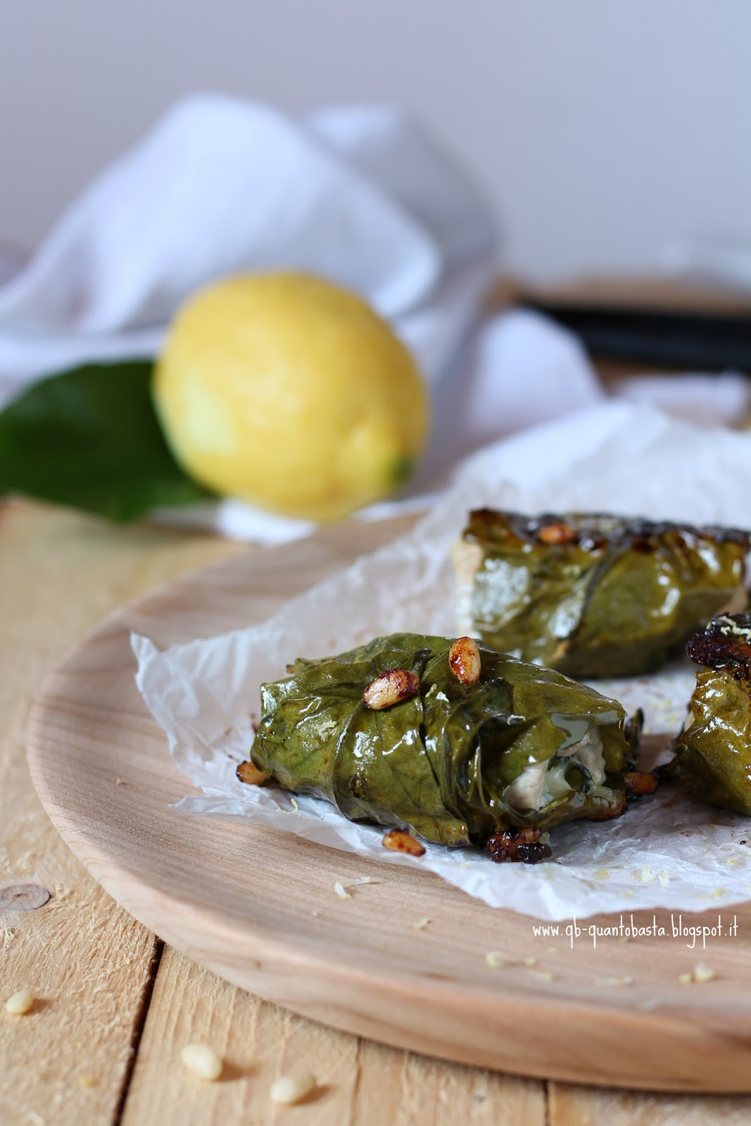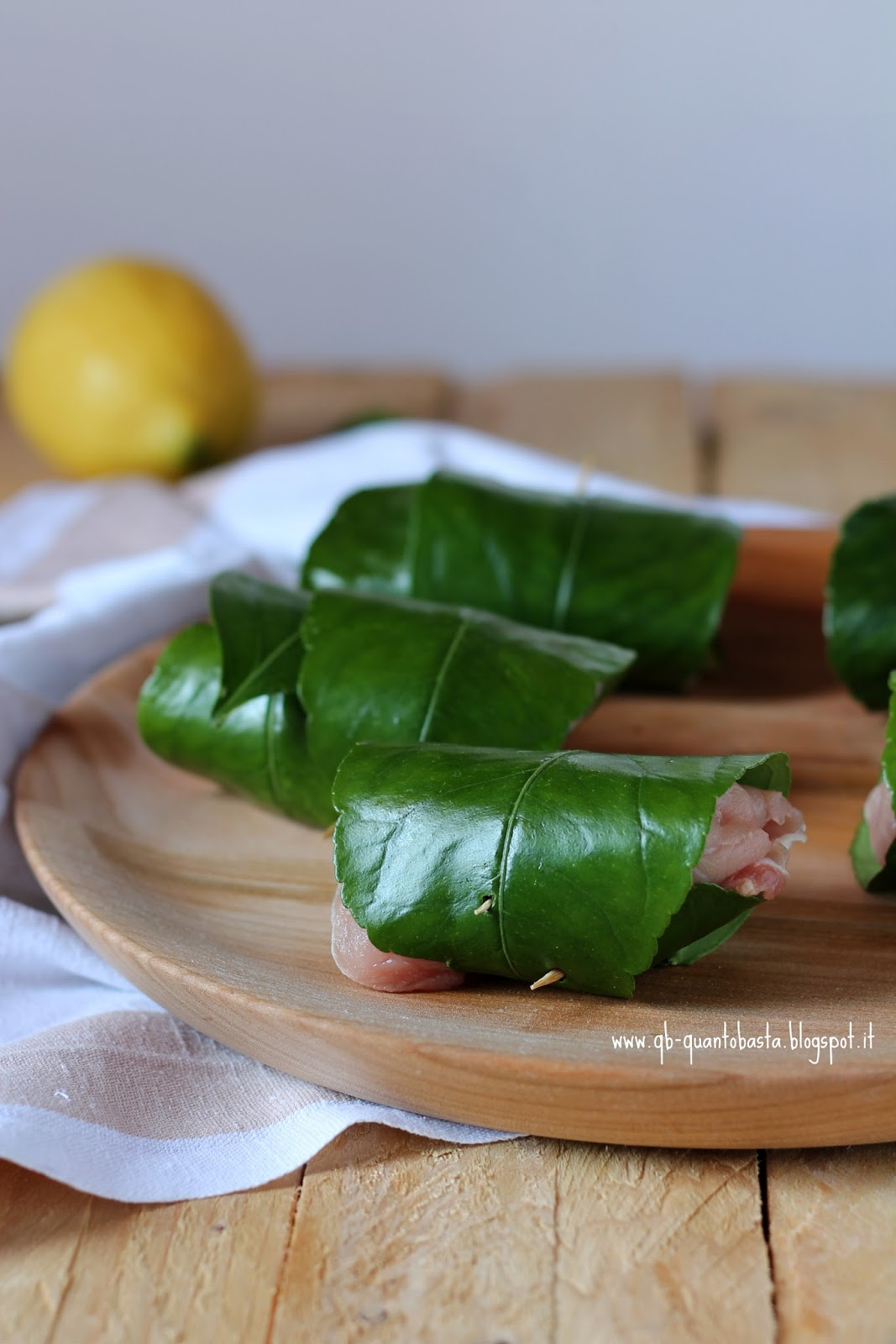 - Aggiustare di sale e pepe e Ripiegare prima i lembi laterali e poi arrotolare ben stretto. Avvolgere nelle foglie di limone e fermare con uno stecchino.