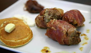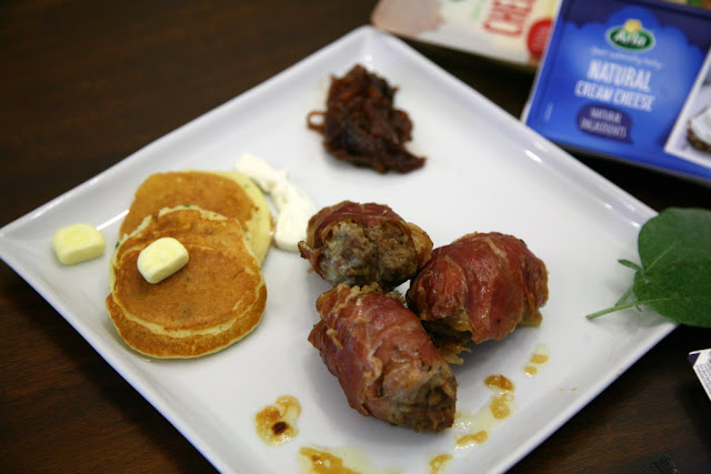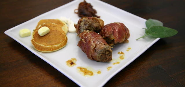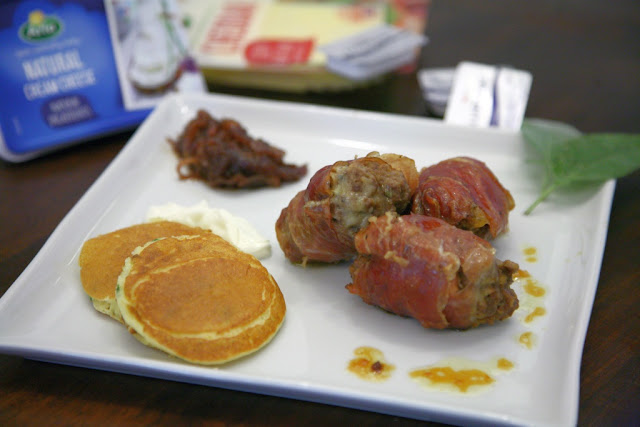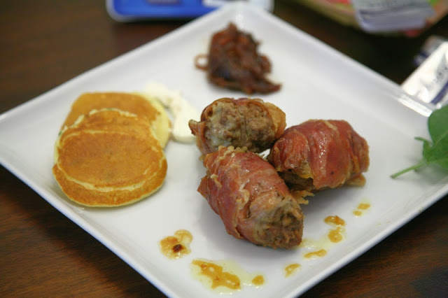 Ho quindi realizzato degli involtini con carne trita e cheddar avvolti nello speck e cotti nella birra e ho deciso di accompagnarli con dei mini pancake salati al cream cheese e un chutney di cipolle di tropea caramellate.