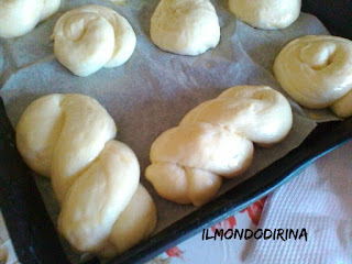 Riprendete l’impasto e formate le treccine e i panini tondi. Fate lievitare per un’altra ora le iris su una teglia ricoperta di carta forno. Infine spennellatele con il tuorlo d’uovo e il latte e infornatele in forno già caldo a 180° per 20 minuti circa ( regolatevi comunque con il vostro forno ).