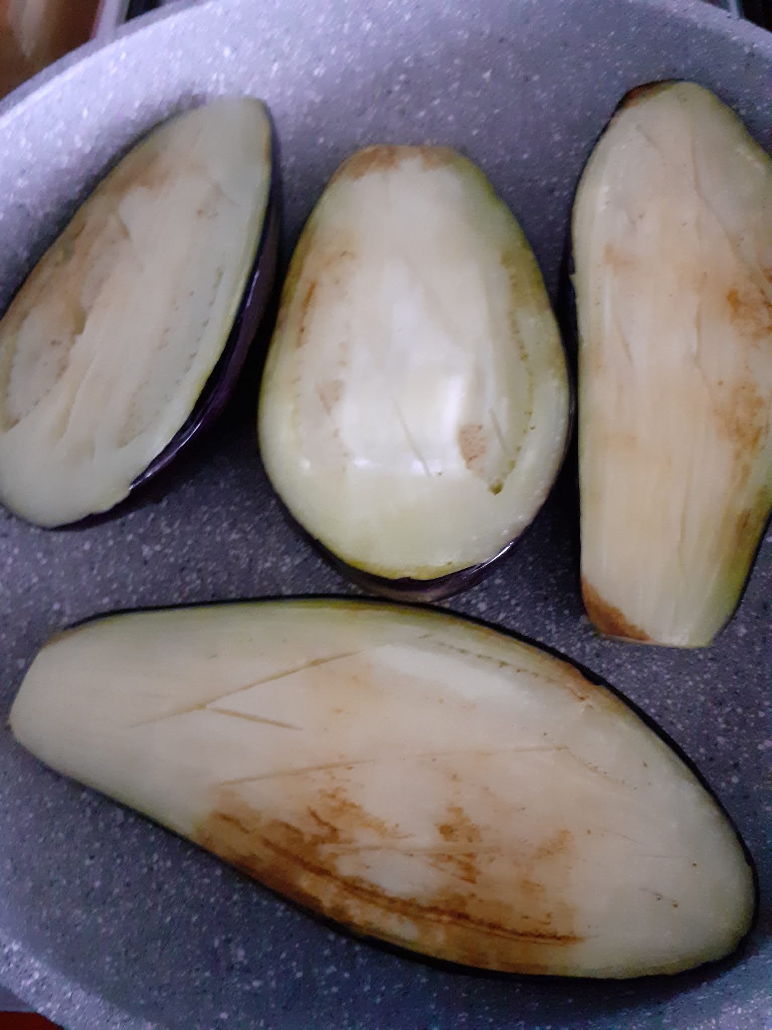 peperoni ed i pomodori. Lasciamo cuocere ed asciugare da eccessivi liquidi. Riprendiamo ora le melanzane e con attenzione cerchiamo di togliere un po’ di polpa (creiamo