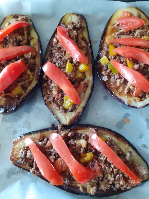 un solco che riempiremo)..lo uniremo alla carne e con esso farciremo le melanzane che appoggeremo in una teglia nella quale verseremo il concentrato diluito in poca acqua calda, non ci resta che decorare con il pomodoro a fette e