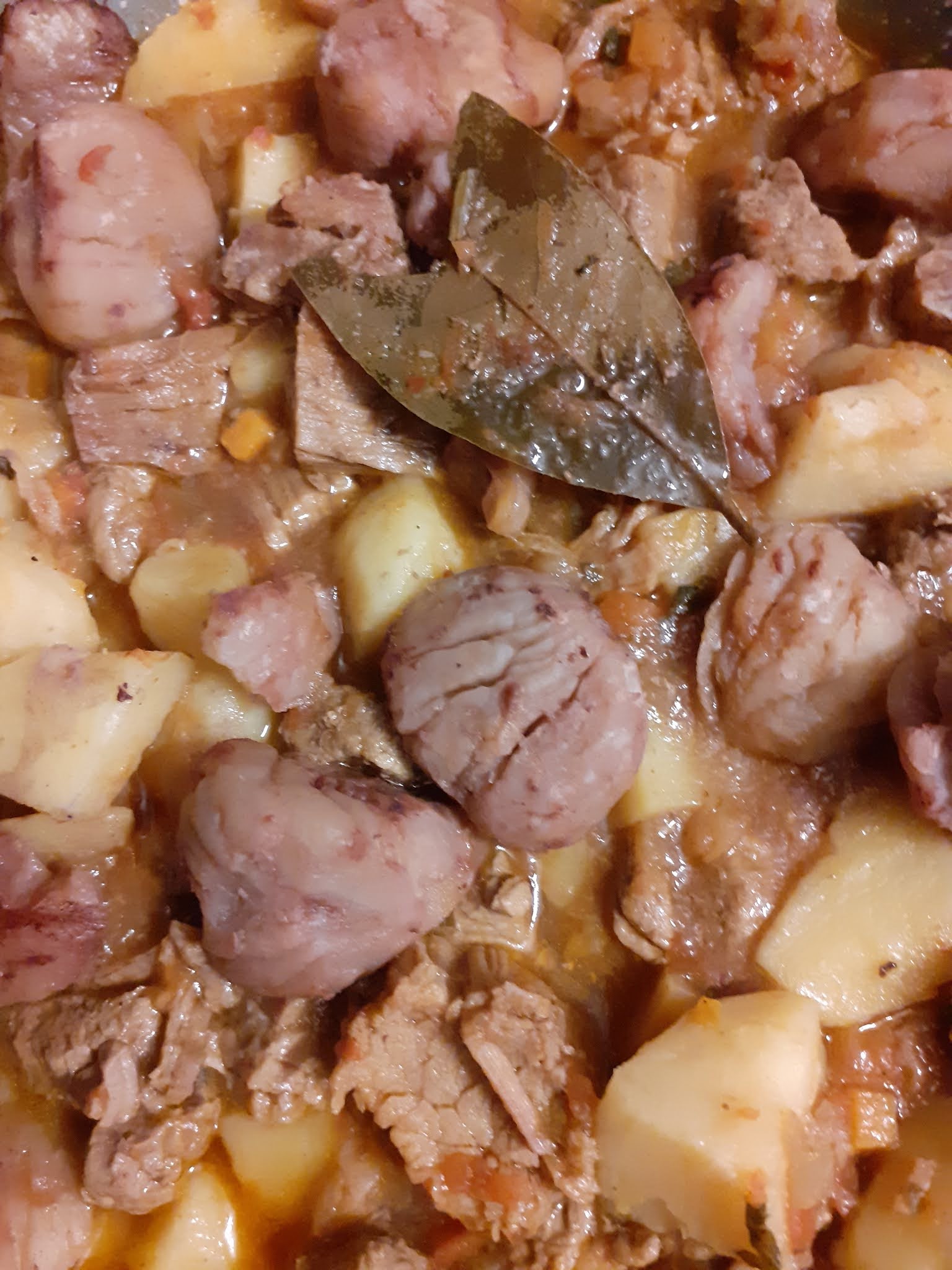1kg di carne di vitellone/400g.di castagne bollite e spelate/2 cipolle/1spicchio d’aglio/sedano e carota tritati/prezzemolo tritato/qualche foglia di alloro/un pizzico di peperoncino/1 cucchiaino di menta/1 cucchiaino di origano/2 chiodi di garofano/un pizzico di cannella/3 patate medie/un pizzico di pepe/olio q.b/200g.pezzettona/1 cucchiaio di concentrato di pomodoro/sale q.b!!