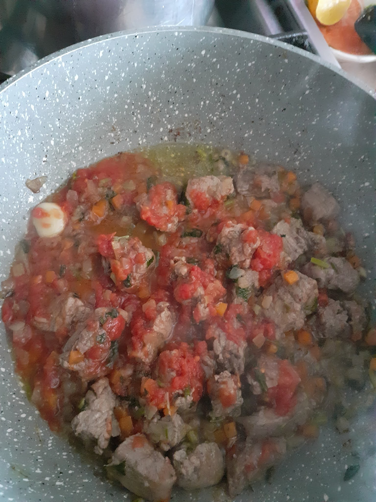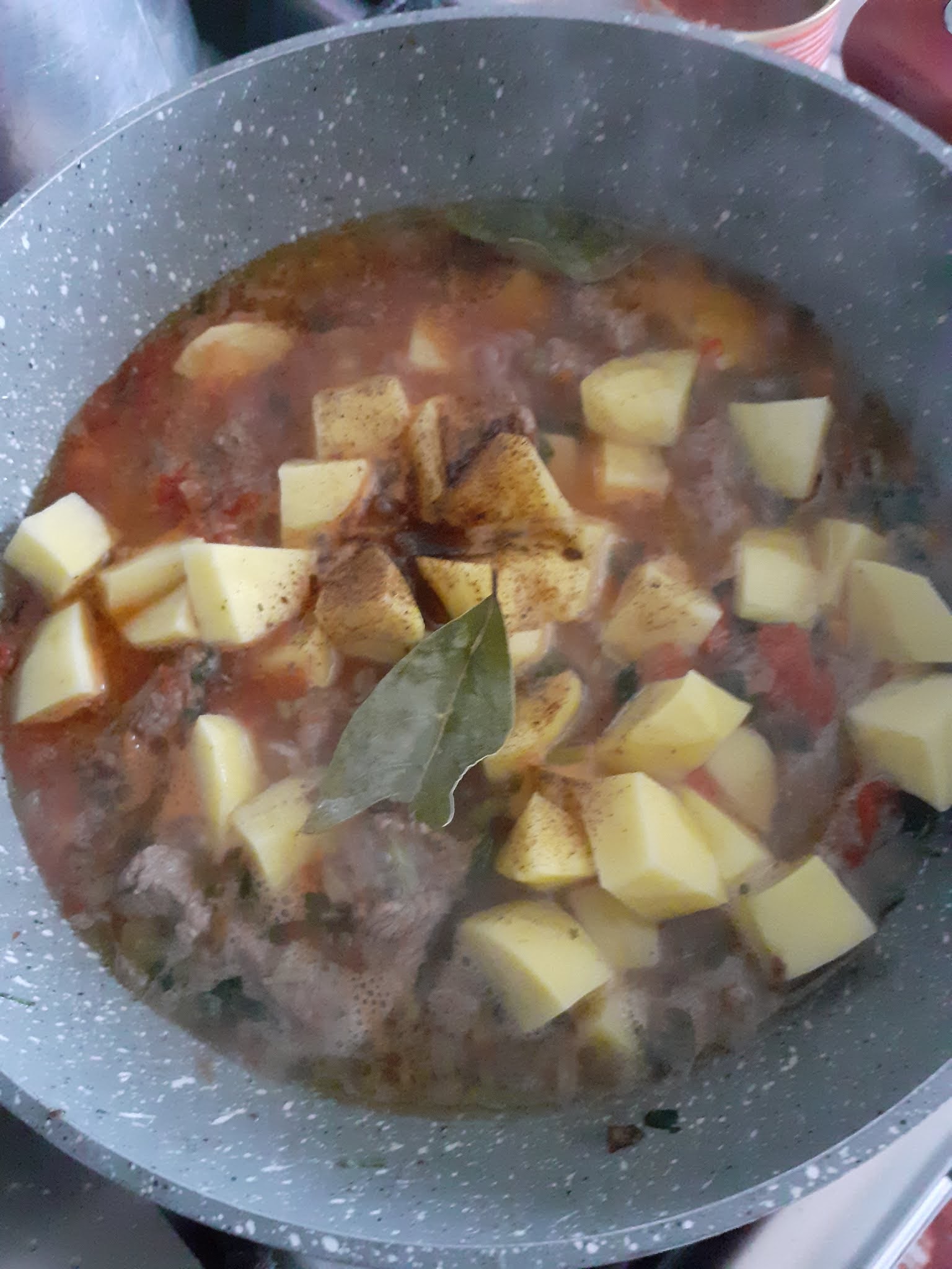 in poco olio far imbiondire il trito di carote e sedano,aglio intero e cipolle,togliere il tutto dal tegame ed aggiungere con altro olio a filo la carne tagliata a pezzetti piccoli,appena la carne รจ ben rosolato rimettere il soffritto(tranne aglio) ,aggiungere il prezzemolo, il concentrato , i pelati tritati,sale,pepe,le varie spezie tutte,coprire a filo con acqua ed aggiugere le patate a tocchetti piccoli!Coprire e lasciare cuocere cca 40′a fiamma bassa,poi aggiungere le castagne e continuare ancora x altri 20′!