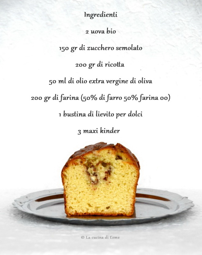 Togliete dal frigorifero le uova e la ricotta almeno 30 minuti prima di iniziare a preparare il dolce. Trascorso questo tempo, utilizzando il robot da cucina o la planetaria, montate le uova con lo zucchero per circa dieci minuti o fino a quando non avranno raddoppiato il loro volume e saranno diventate una bella massa chiara e spumosa. Di seguito, sempre montando, aggiungete l’olio a filo. Quando sarà stato bene assorbito dal composto, riducete la velocità ed incorporate un paio di cucchiai di farina, mescolate e poi aggiungete la ricotta poco per volta, continuando a lavorare. Una volta che sarà tutta ben incorporata, proseguite aggiungendo la farina, precedentemente setacciata con lievito, anch’essa poco alla volta e sempre a bassa velocità. Otterrete un impasto cremoso. A questo punto eliminate le fruste e aggiungete le barrette di cioccolato, spezzate grossolanamente con le mani e amalgamate l’impasto con l’ausilio di una paletta in silicone. Trasferite il composto in uno stampo da plum cake, precedentemente foderato con carta forno ben inumidita e strizzata, infornate a 180° in modalità statica per circa 50 minuti. Sfornate e lasciate raffreddare molto bene su una gratella per dolci prima di conservarlo sotto la classica campana. Rimane soffice e goloso per quattro giorni … oltre non saprei dirvi, in casa i dolci spariscono velocemente.