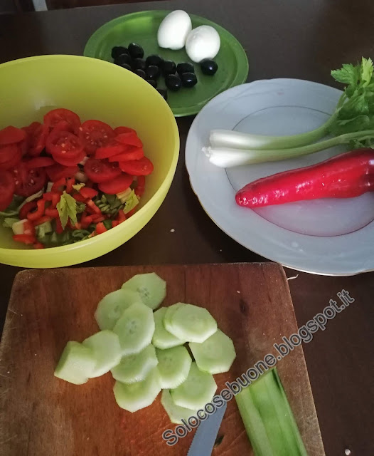 A parte tagliamo a pezzettini il sedano, i pomodori, i peperoni i cetrioli e la cipolla.