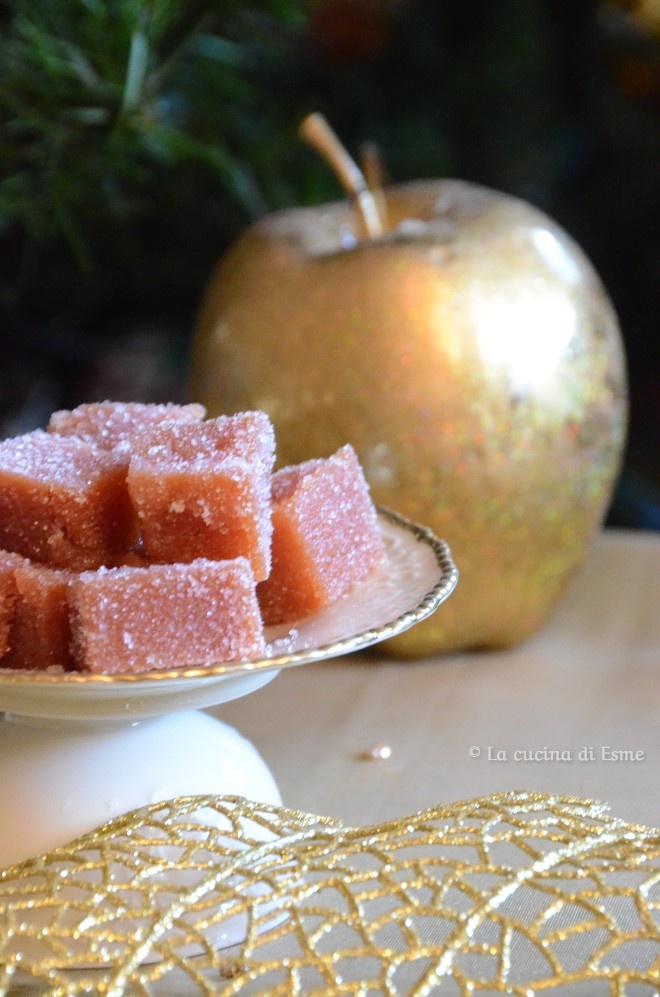 Scegliete mele cotogne mature, preferibilmente integre e senza macchie. Lavatele sotto l’acqua corrente, facendo attenzione ad eliminare bene tutta la peluria. Tagliate le mele a tocchi grossi senza sbucciarle, eliminando solo il torsolo ed i semi. Prendete una pentola di acciaio dal fondo spesso e dai bordi alti, mettete i pezzi di mela e ricopriteli di acqua, aggiungete il succo di limone, coprite e cuocete per circa 40 minuti su fiamma moderata, o fino a quando saranno tenere ma non sfatte. Scolate i pezzi di mela con un mestolo forato e passateli col passaverdura (disco fine) fino ad ottenere una purea, pesatela e poi mettete la purea in una pentola con l’80% del suo peso in zucchero (per 1 kg di polpa di mele occorrono 800g di zucchero) unite qualche goccia di limone e cuocete a fuoco basso, mescolando continuamente, per 30/40 minuti. Man mano che la cotognata cuoce, la purea diventerà più scura e lucida (sarà pronta quando presa con un cucchiaino non scivolerà via). Una volta pronto versate il composto in uno stampo quadrato a bordo basso, foderato preventivamente di carta forno leggermente inumidita, livellate la cotognata dandogli l’altezza di un paio di centimetri, coprite con un coprivivande a velo e lasciate raffreddare completamente. Per cinque o sei giorni, una volta al giorno, girate la cotognata su sé stessa, al fine di farla asciugare completamente. Una volta che la cotognata sarà ben asciutta, tagliatela a cubetti regolari e poi passate ogni cubetto nello zucchero semolato ricoprendolo ben bene. Conservate in una scatola di latta. Buon appetito!