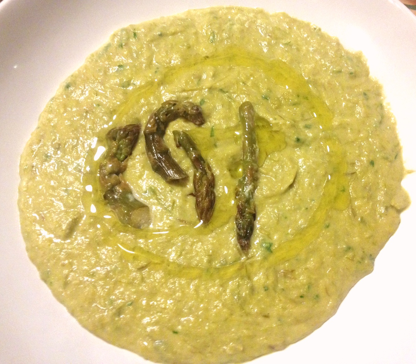 Servi aggiungendo le punte di asparago a mo’ di decorazione e un filo di olio crudo.