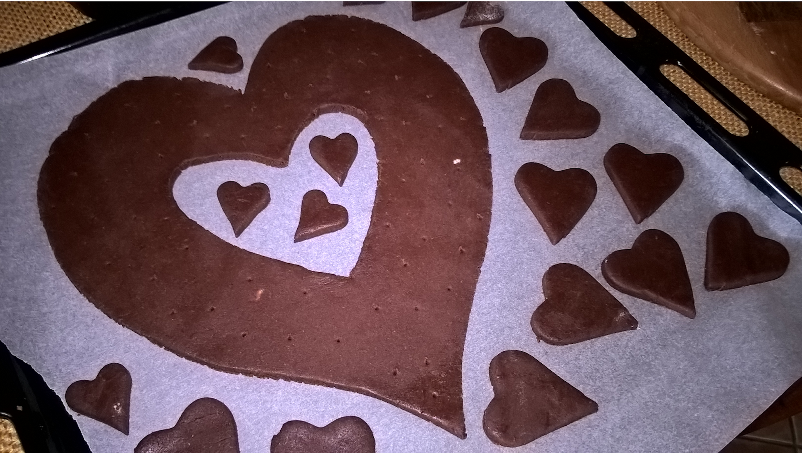Riprendete la pasta, tiratela con il mattarello e ritagliate la forma che volete realizzare: può essere un numero o una lettera dell’alfabeto o per l’appunto un cuore. Con la pasta che avanza ricavate tanti biscottini: potrebbero essere usati per la decorazione o per la vostra colazione. Passate in forno per 10/15 minuti a 180°.