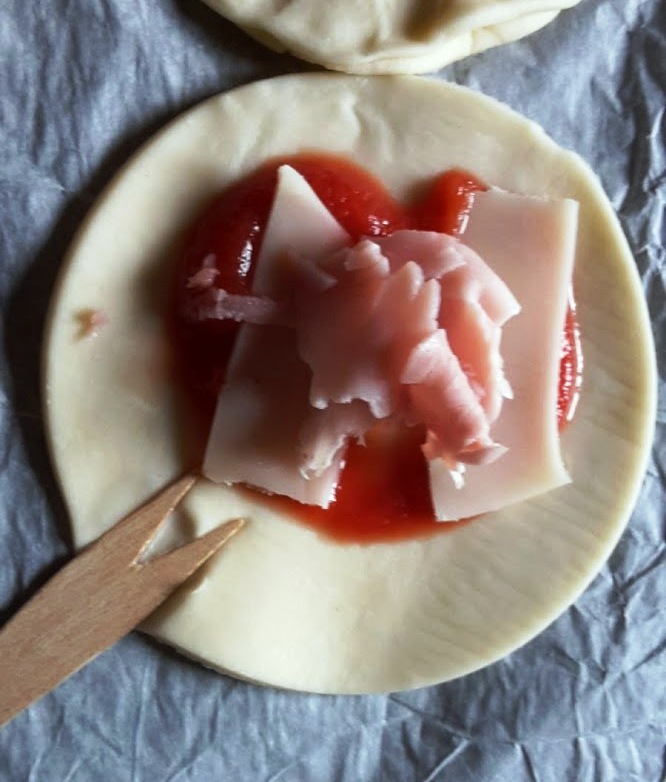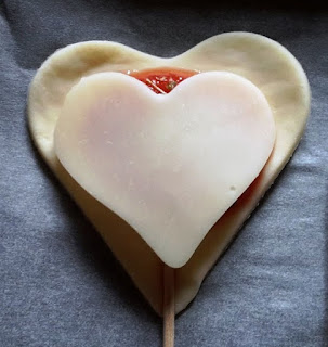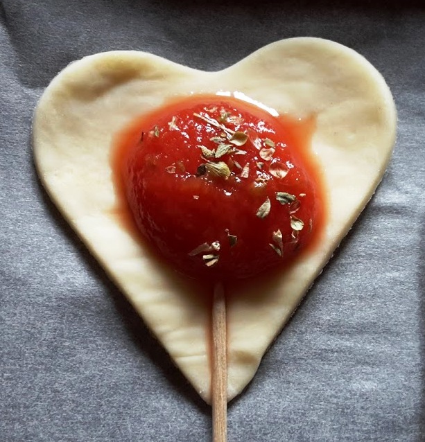 Porre al centro del cuoricino un cucchiaino di salsa di pomodoro densa ( altrimenti scappa!) mescolata con origano…