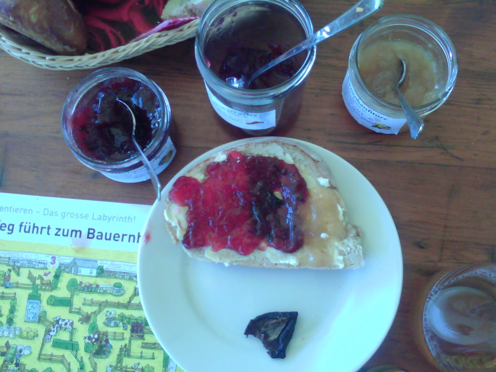 Dai formaggi al caffè tutto protetto da una pellicola che tiene lontane le mosche, anch’esse km0, come il resto preparato dalla figlia dei fattori. Gli affettati inducono a pensare che prima c’erano altri maiali al posto di quelli che ho conosciuto nella suite. Cose che capitano. Quasi sempre i maiali che vedete non sono quelli della volta prima… Succo di mela, yogurt di Ribes (Meertrubeli se vi sentite svizzeri, Johannisbeeren tedeschi, Ribiseln austriaci) con marmellate di vari gusti e colori faccio un panino stile Mondrian. Latte appena munto come se piovesse.