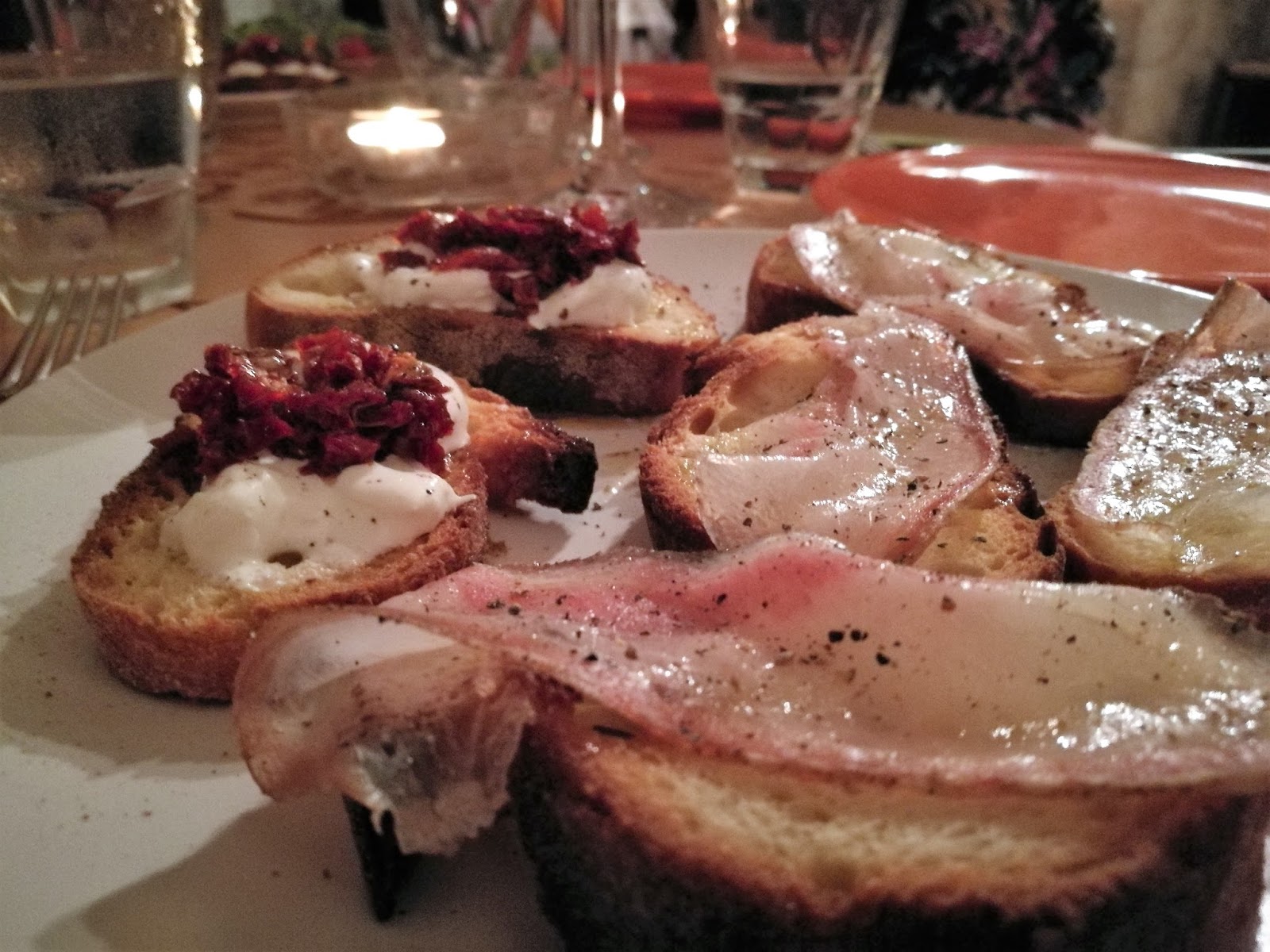 Ad accompagnare il tutto tre varietà di bruschette, pane fresco di un panificio di Corato (veramente gustoso e profumato), la prima di queste con burrata andriese e pomodori secchi tagliati a strisciette, una con ricotta forte, lardo di colonnata e infine la classica con olio e pomodori freschi.