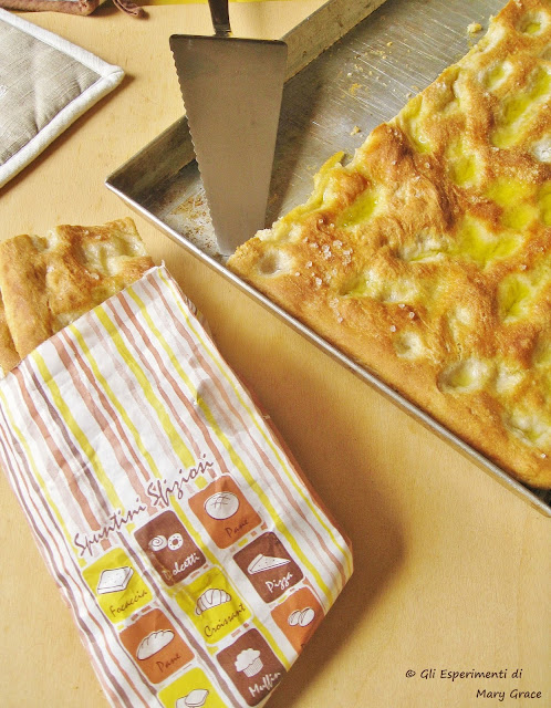 Eccomi, pertanto, emozionatissima, a fare le presentazioni ufficiali: una fugassa semplicemente perfetta, qui nella versione che tanto piace alle idrovore di Casa MG, ovvero con olio extravergine come se piovesse ad insinuarsi negli oeuggi.