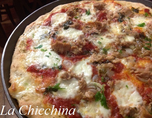 Passata l’ora prevista per la lievitazione riprendere la pasta e stenderla in una teglia rotonda, distribuire la passata, l’intingolo di cipolla e prezzemolo(eliminare il peperoncino), la mozzarella a fette precedentemente asciugata e il tonno. Insaporire con il sale, l’origano e magari ancora un goccino d’olio.