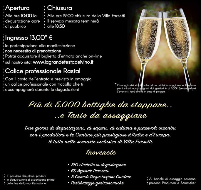 Ci saranno 3 Grandi Degustazioni Guidate, che offriranno la possibilità di degustare dai 7/8 grandi vini raccontanti da relatori di grande spessore; Domenica 11 Settembre I GRANDI RIESLING e I GRANDI VINI ROSSI DOCG, Lunedì 12 Settembre LE GRANDI BOLLE.