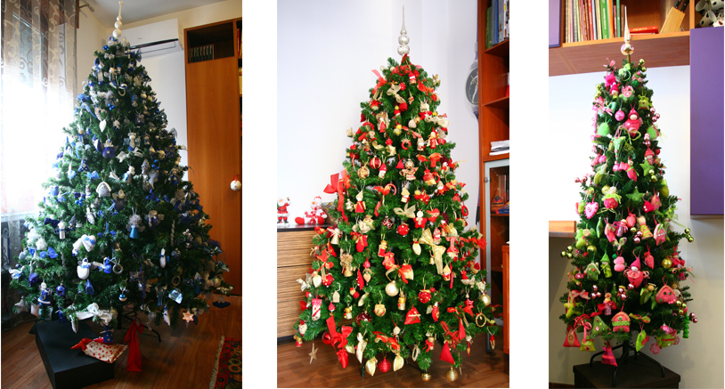 Ed eccoli qua i tre alberi: bluette e argento, rosa e verde acido, rosso e oro.