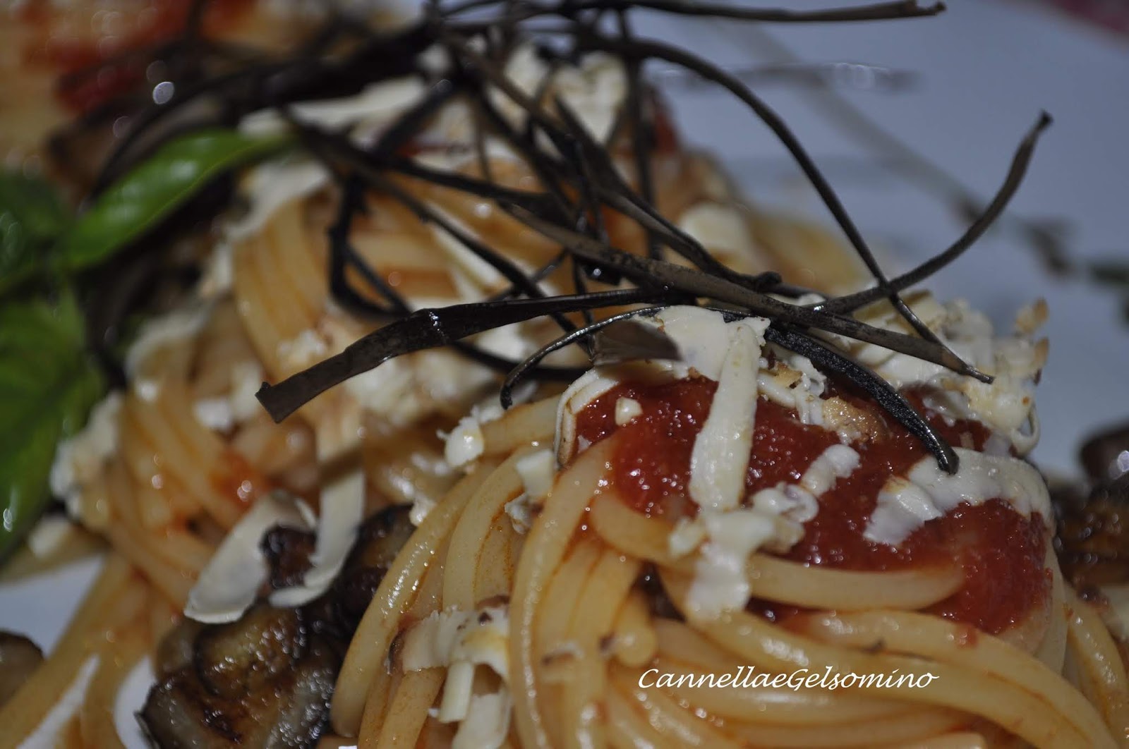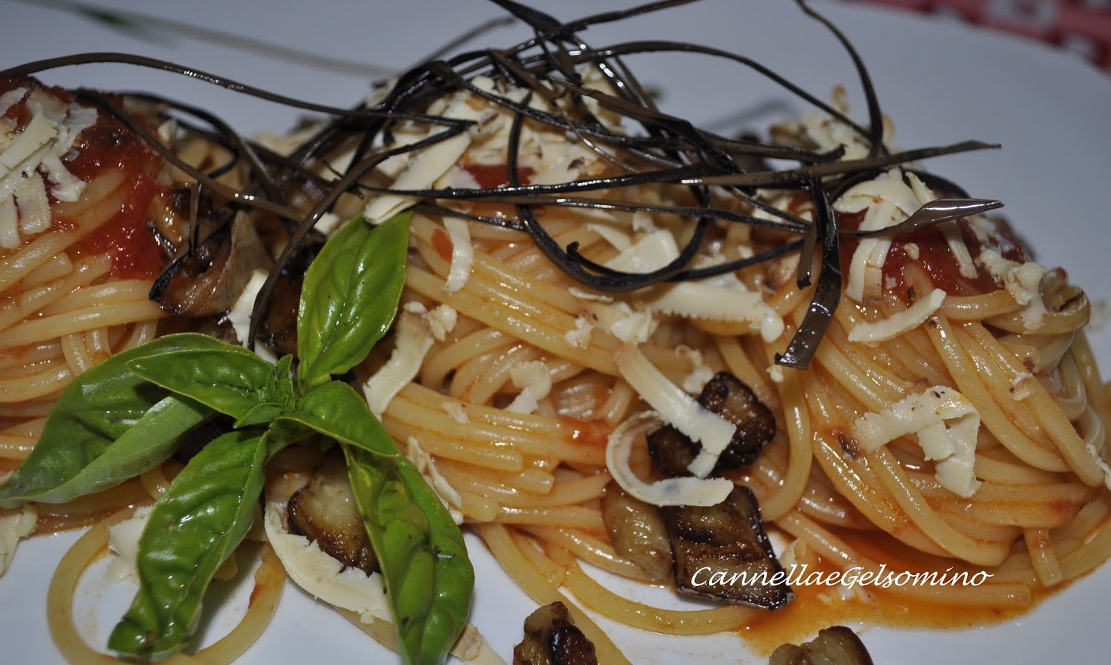 La pasta alla Norma è un tipico piatto della tradizione siciliana: normalmente si tratta di maccheroni conditi con salsa di pomodoro, melanzane fritte, ricotta salata grattugiata e basilico fresco. Come al solito però, pur nel rispetto della tradizione, mi permetto qualche divagazione seguendo i miei gusti personali: innanzitutto il formato che ho scelto è quello degli spaghetti, la salsa di pomodori non è fatta con i pelati ma con i datterini freschi e la ricotta salata è sostituita dalla ricotta al forno, altra specialità sicula meno forte, riguardo al sale, rispetto all’altra.