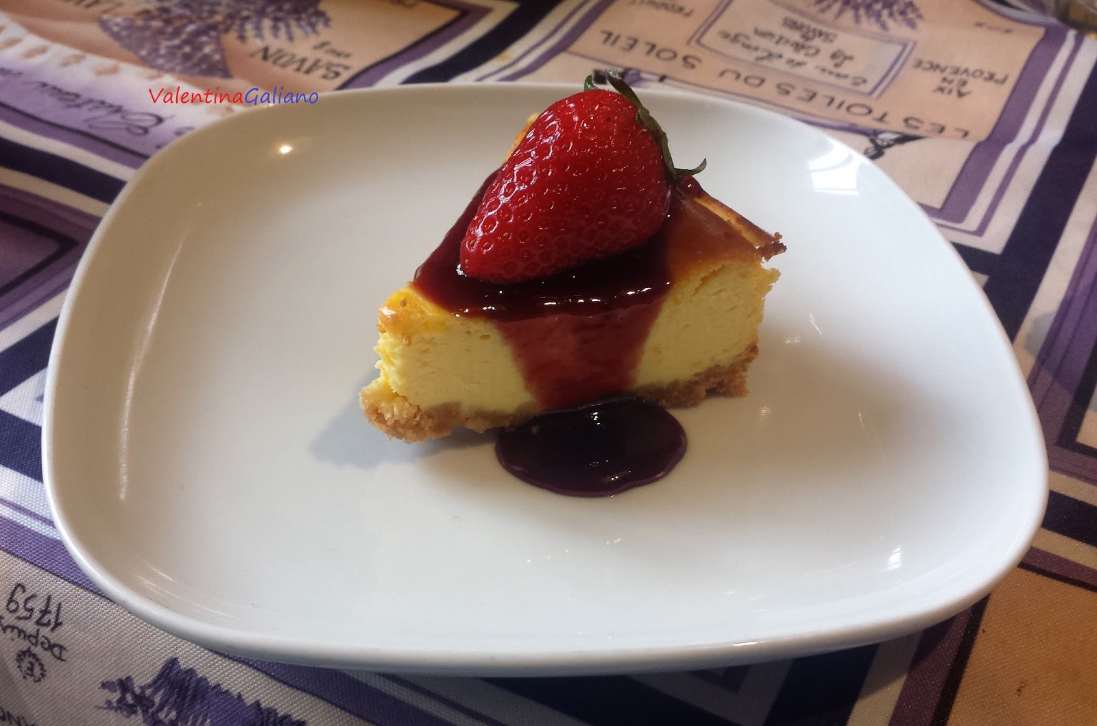 Toglietela quindi dal frigo e guarnite la superficie con la salsa ai frutti di bosco (io l’ho acquistata già pronta ma è molto semplice da preparare, facendo cuocere a fuoco lentissimo i frutti rossi con lo zucchero e poca acqua e mescolando di continuo). Decorate la Cheesecake con dei bei fragoloni in precedenza ben lavati e asciugati, da porre al di sopra della salsa di frutti di bosco.