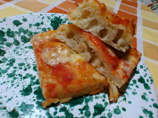 Fare la pizza con il metodo di Gabriele Bonci era il mio pallino. E così mi sono informata, ho letto tante ricette e visto pure i video di questo Michelangelo della pizza, come è stato ribattezzato. Ed effettivamente il risultato è stato una pizza morbida, ben alveolata e molto digeribile. Di sicuro non credo di aver sfornato la vera pizza di Bonci, di lievitazione ne so zero o quasi rispetto ad un maestro come lui che utilizza farine speciali e LM, ma questa tecnica permette di avere buoni risultati anche con il lievito di birra e la farina manitoba. Lievito secco e non fresco, perchè secondo lui il panetto nella filiera potrebbe aver subito maltrattamenti che inficerebbero la riuscita della lievitazione. La caratteristica che contraddistingue questa pizza è la lunga lievitazione, si prepara infatti 24 ore prima di essere consumata, lasciandola lievitare lentamente in frigorifero tutta la notte e il giorno dopo. Certamente con i ritmi frenetici della nostra vita può sembrare difficoltosa questa tecnica con una lievitazione così lunga, però pensandoci bene la nostra salute vale qualche sforzo in più.