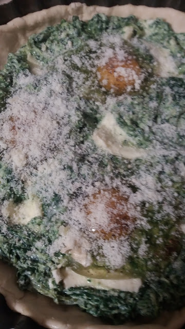 Con una parte dell’impasto lievitato foderare una teglia,bucherellare e farcire con la crema di spinaci,