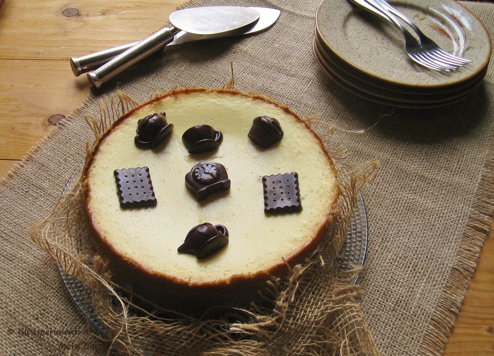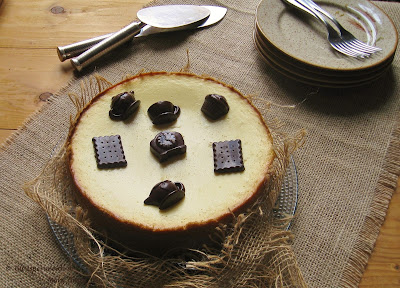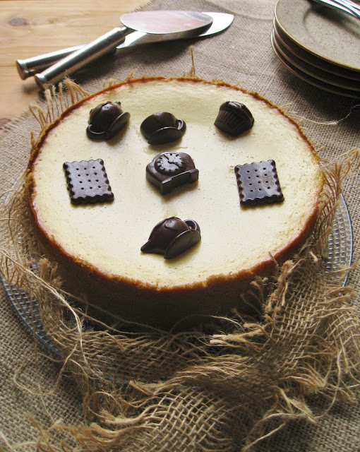 E come se non fossero stati sufficienti pandolci, panettoni e pandori, inaspettata e tentatrice giunse l’idea di preparare una Cheesecake destinata alla sontuosa chiusura del cenone di fine anno (il cioccolatino a forma di orologio, non a caso, è stato posto al centro della torta).