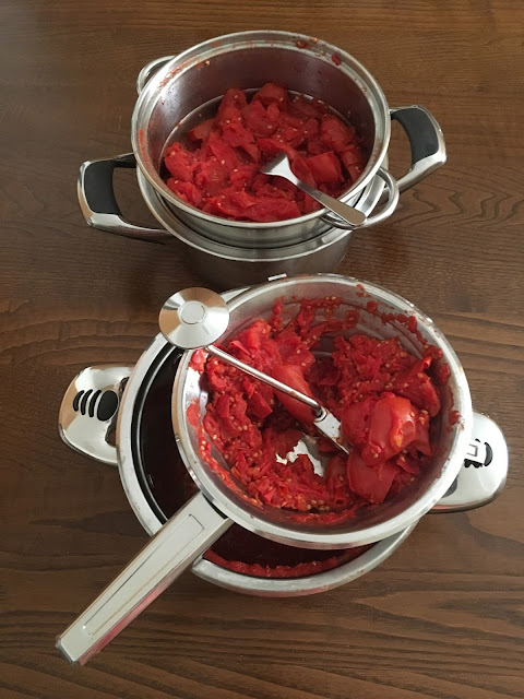 Questa è una delle preparazioni simbolo dell’estate. Quando ero bambina e andavo in vacanza dai miei nonni che vivevano in campagna e questo diventava un lavoro comunitario, tutti davano una mano, perché si facevano quintali di passata, pomodori pelati, il concentrato, così serviva l’apporto di tutti. Adesso per me è il lavoro di poche ore, perché detesto fare queste sfacchinate, perciò la faccio “a rate”, lavorando al massimo 5 kg di pomodori alla volta. Poi dopo qualche giorno ne faccio altri e così non divento matta, ma in inverno posso godermi un bello spaghetto al pomodoro come se fosse estate. Questa è la classica preparazione che varia da una famiglia ad un’altra: io la faccio così.