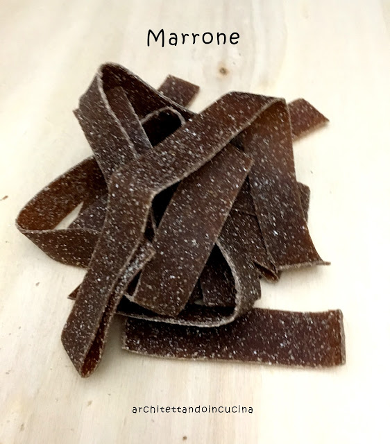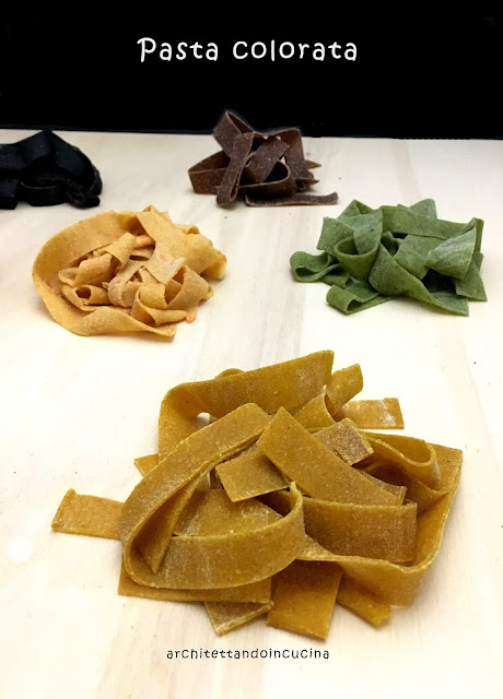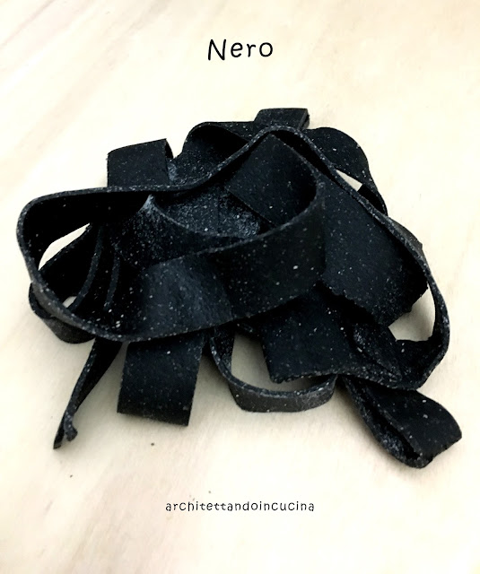 Il nero si ottiene con il nero di seppia. Occorre una vescichetta ogni 100 g di farina ed è assolutamente consigliabile rispetto alle bustine in vendita nei supermercati, ma se usate queste ultime, seguire le indicazioni riportate sulla confezione. Le vescichette naturali, vanno stemperate i una ciotolina con 1 cucchiaio di acqua, quindi se l’aimpasto risultasse un po’ troppo morbido aggiungete un po’ di farina. Naturalmente questa pasta si abbina bene con tutte le verdure e con il pesce.