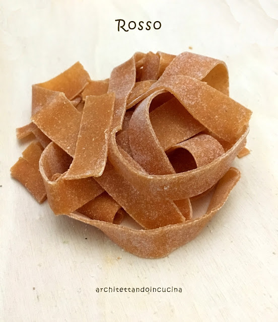 Il rosso si ottiene con il concentrato di pomodoro in maggiori quantità ed eliminando completamente i tuorli. Quindi con 1 albume ed 1 cucchiaio di concentrato per 100 g di farina. Si può aggiungere anche il liquore alchermes, che in cottura si perde quasi totalmente come sapore.