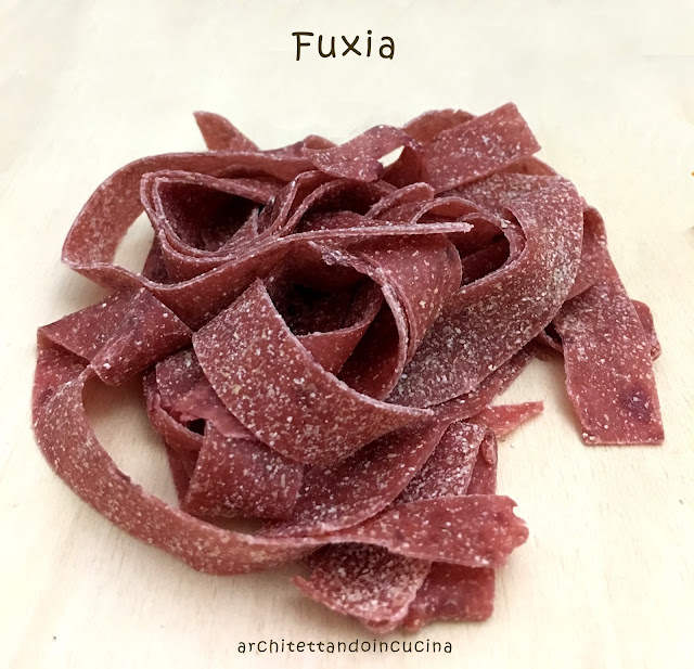 Il fuxia si ottiene con la rapa rossa bollita, ridotta in purea e aggiunta alla fontana nella misura di 60 g per ogni 100 g di farina.