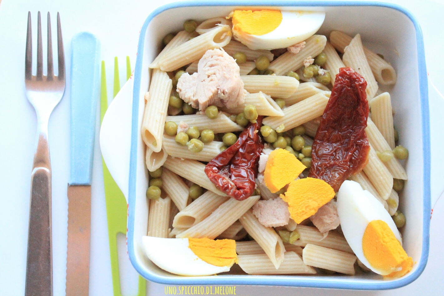 Nel frattempo prepariamo in un contenitore il tonno (privato della sua acqua) e i pomodorini: li ho scelti sott’olio così sono ben saporiti e non c’è bisogno di aggiungere né sale, né olio! Però, se preferite, potete aggiungere quelli non sott’olio e, dunque, condire!