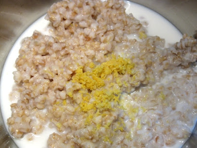 Porre il grano in un pentolino, aggiungere il latte e la buccia grattugiata del limone e scaldare per 10′ mescolando con cura fin quando il composto diventa cremoso.