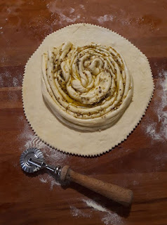 La parte più piccola va stesa ad uno spessore più alto, mentre la parte più grande va stesa il più sottile possibile, cosparsa di olio e fiori di sambuco e va ripiegata a ventaglio e arrotolata su se stessa.