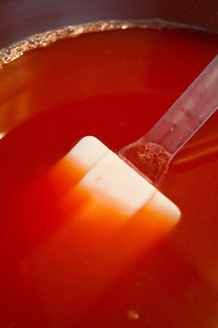 Filtrare il tutto per eliminare eventuali grumi ed i fiori, unire il restante succo e portare sul fuoco a fiamma bassa bassa , rimestando continuamente con un cucchiaio di legno