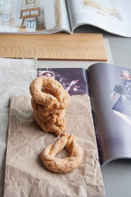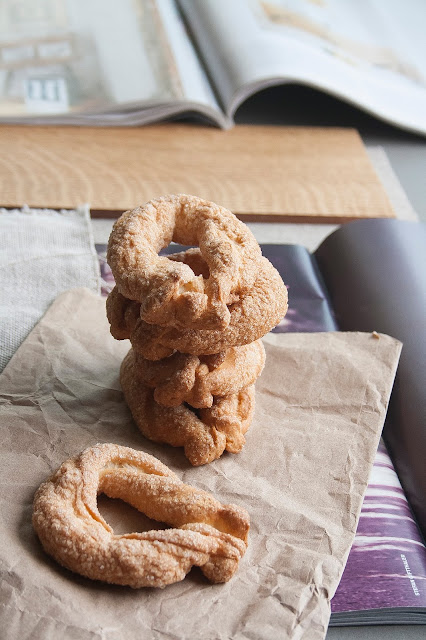 Passare il cilindro nello zucchero e sovrapporre le estremità dello stesso, conferendo al torcetto la caratteristica forma a goccia. Proseguire allo stesso modo con il resto della pasta.